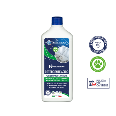 Lavaggio fine cantiere, dopo posa, rimozione incrostazioni: diluire 100/150 ml (10-15 tappi da 10 ml) di B-DESCALIX 100 in un litro d’acqua. Procedere al lavaggio distribuendo la soluzione sulla superficie mediante monospazzola oppure con mop o panno idoneo e lasciare agire per qualche minuto. Frizionare energicamente con spazzolone; successivamente raccogliere i residui del lavaggio con aspira liquidi o mop/panno o con altra attrezzatura adeguata. Risciacquare accuratamente. E’ possibile ripetere l’operazione in caso di necessità.
